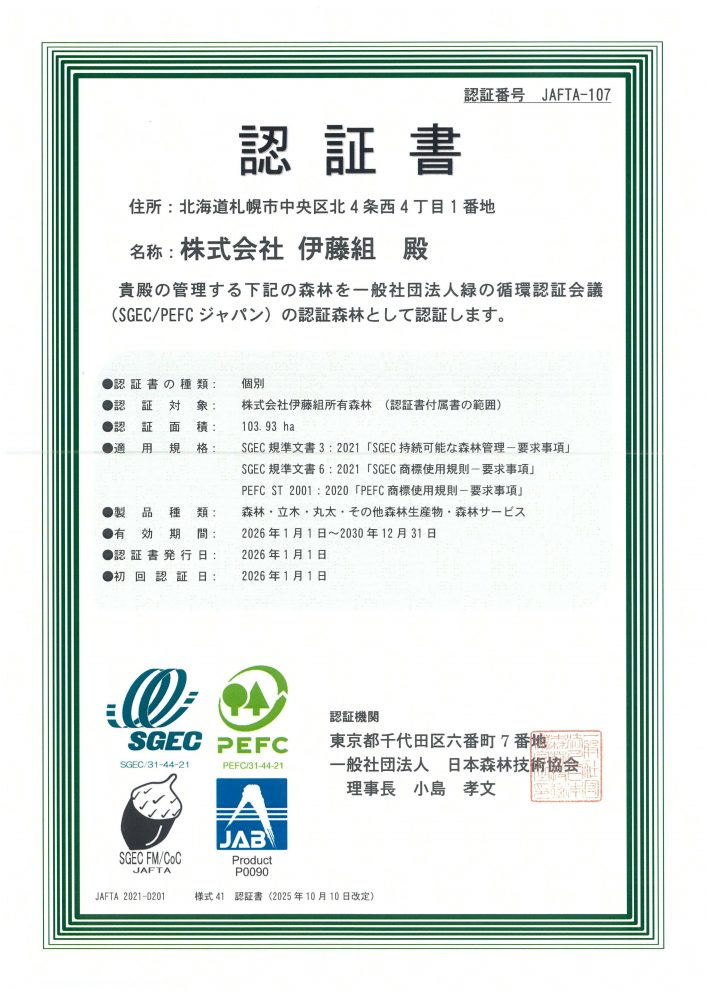 当社は、北海道津別町に所有する伊藤組布川山林において、2026年1月にSGEC/PEFC森林認証を取得しました。
